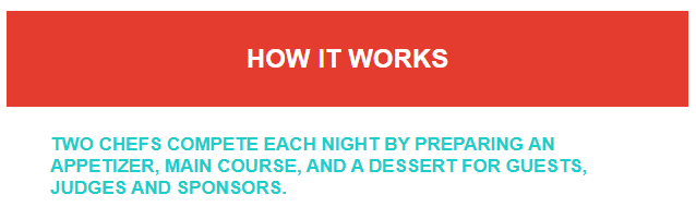 Each evening features secret ingredients that the chefs must incorporate into the dishes. Guests and culinary judges will vote on each course to decide which chef that evening advances to the next round. Guests enjoy a fun-filled evening with great food, yummy cocktails, lots of excitement and all for a great cause!